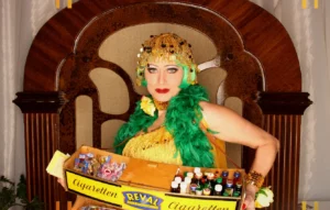 Das Aussehen des Bauchladenmädchens kann gerne auf das Event abgestimmt werden, sei es im Charlestonoutfit, Frack & Zylinder, Dirndl…