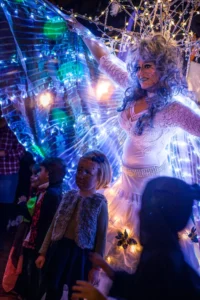 Ein „Living Doll“ zieht immer die Blicke auf sich. Die Puppe kommuniziert nonverbal mit den Anwesenden, schüttelt Hände, verteilt „süße“ Geschenke aus ihrem Beutelchen und reagiert einfach auf alle Begebenheiten mit spontanen Reaktionen und entlockt so manches Schmunzeln … und machmal kann man auch Puppen zum Singen wachküssen!