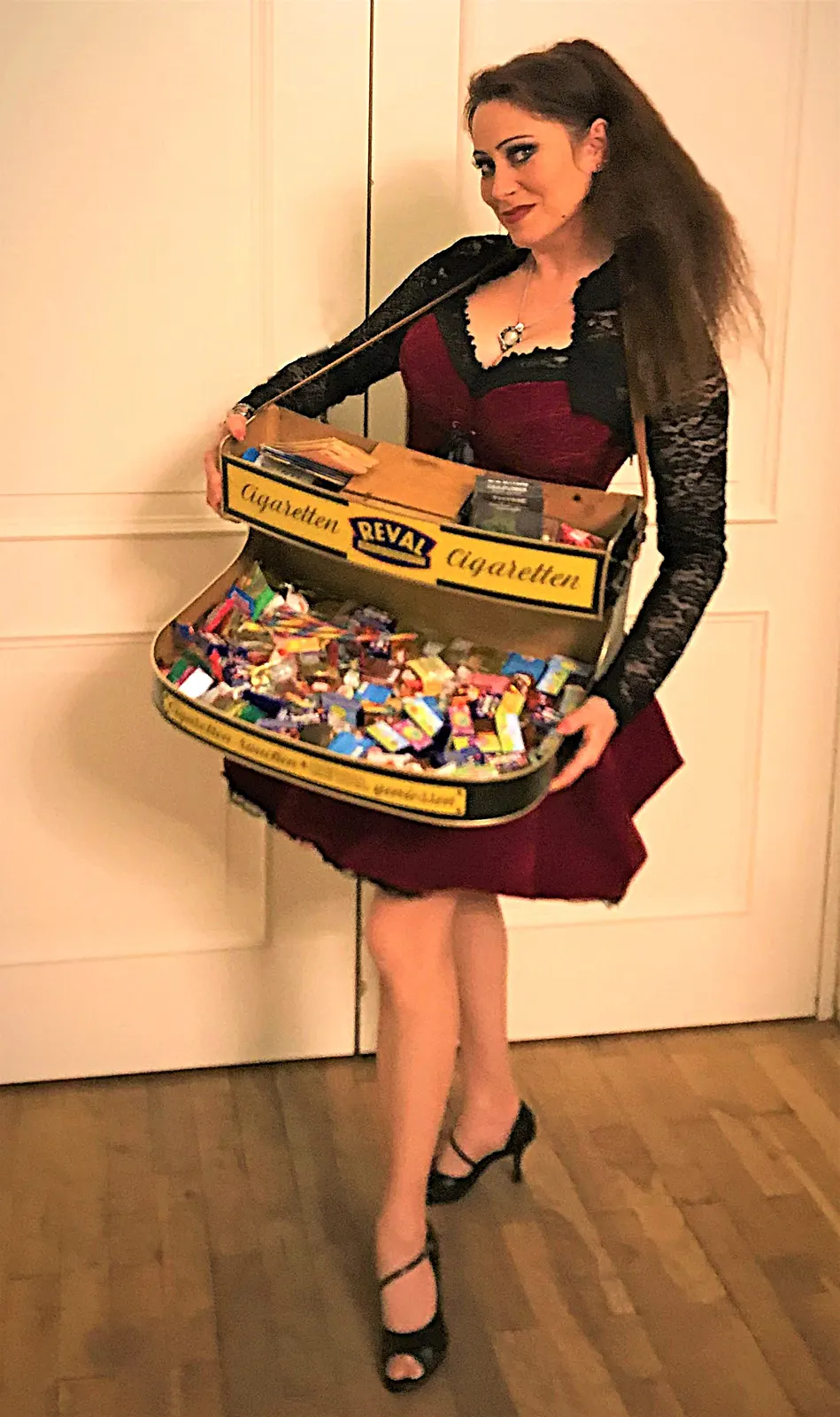 Das Aussehen des Bauchladenmädchens kann gerne auf das Event abgestimmt werden, sei es im Charlestonoutfit, Frack & Zylinder, Dirndl…